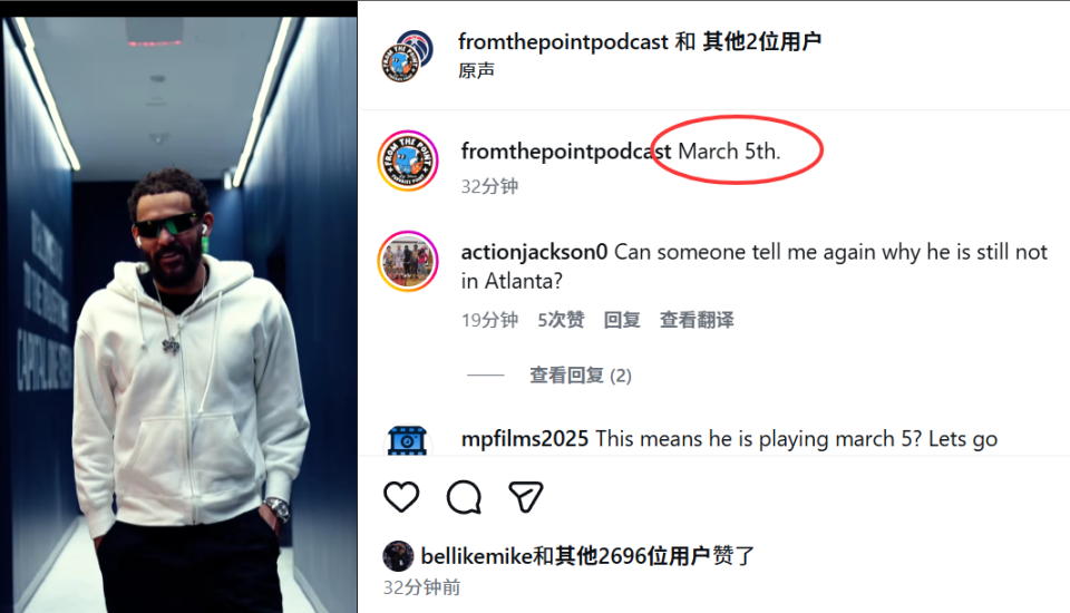 特雷-杨在自己IG上也晒出短片,配文:3月5日(当地时间)。